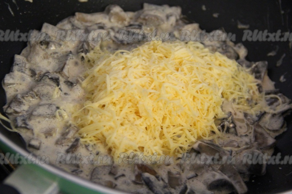 Затем добавить сыр, всё хорошо перемешать. Томить грибы под крышкой, на медленном огне примерно 10 минут до полного растворения сыра. Периодически помешивать.