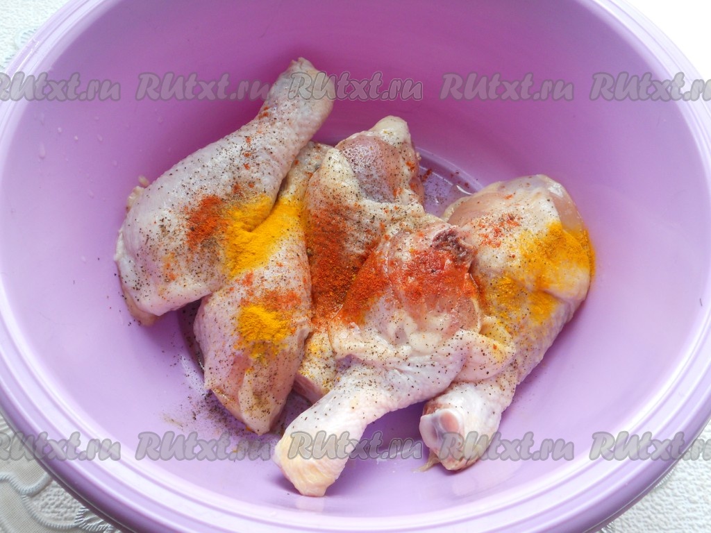 Куриные ножки помыть и обсушить. Посолить, посыпать паприкой, карри и черным молотым перцем. Перемешать, чтобы специи и соль распределились равномерно.