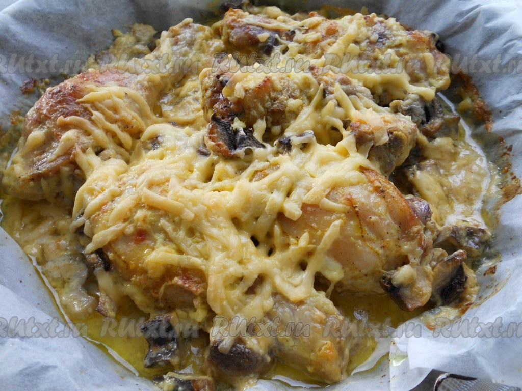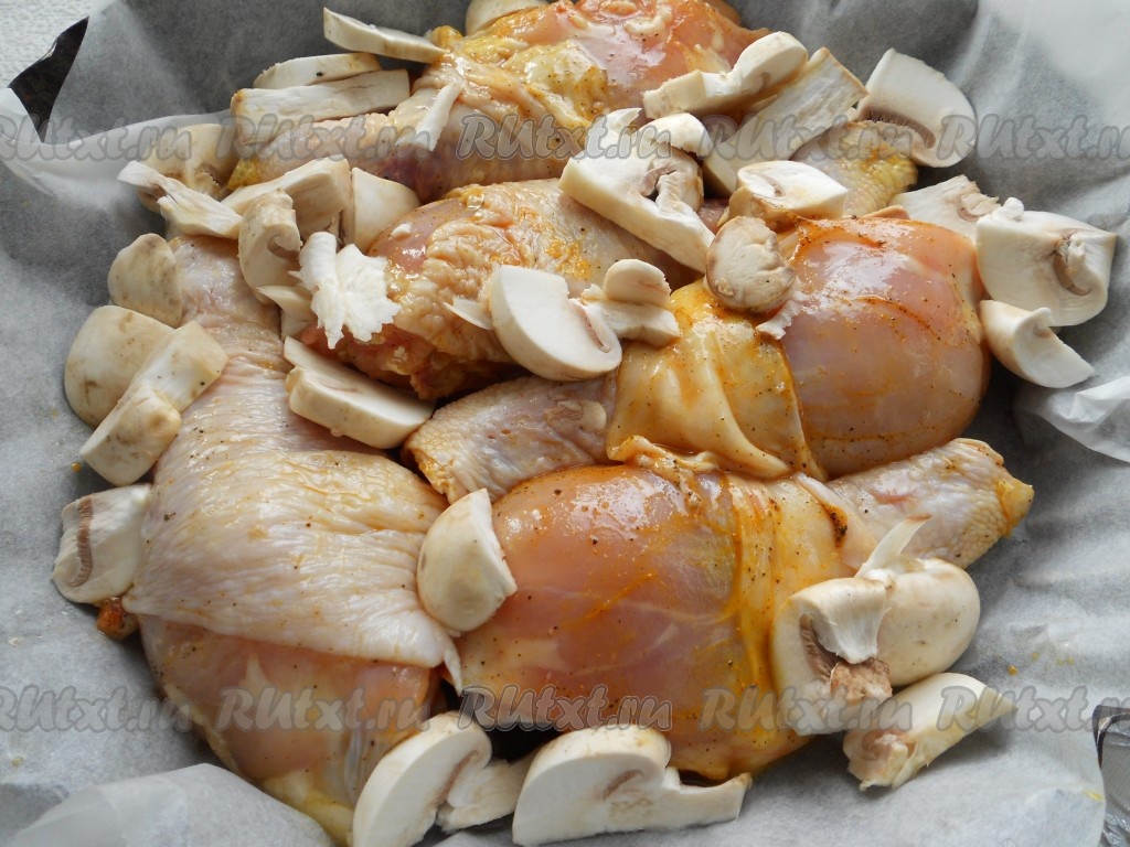 Для приготовления куриных ножек с грибами в духовке понадобится:
