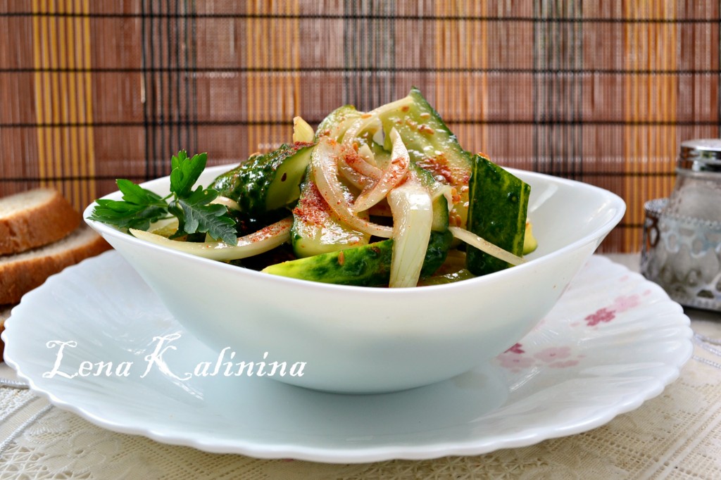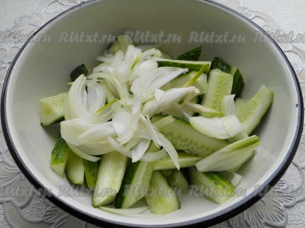 Добавить к огурцам порезанный тонкими полукольцами репчатый лук.