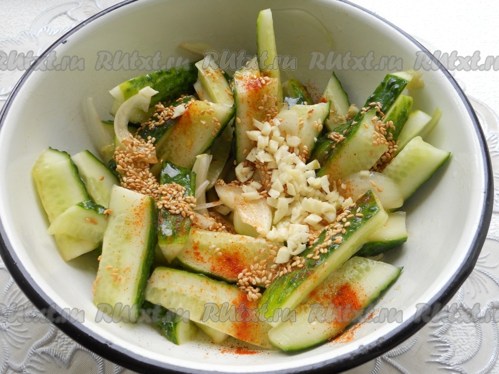 Добавить обжаренный кунжут вместе с маслом в китайский салат из огурцов. Также добавить измельченный чеснок. По вкусу досолить (если понадобится). Хорошенько все перемешать.