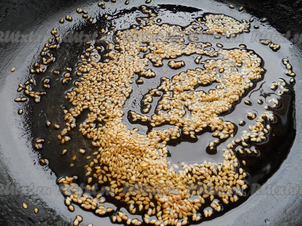 В сковороду влить растительное масло и хорошо разогреть. Всыпать в масло кунжут и, постоянно помешивая, обжарить его до светло-коричневого цвета (темнеет очень быстро, понадобится минуты 2 - не пережарьте).