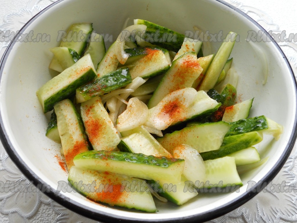 Огурцы порезать длинными ломтиками. Посолить и оставить на 30 минут. После чего выделившуюся жидкость слить.