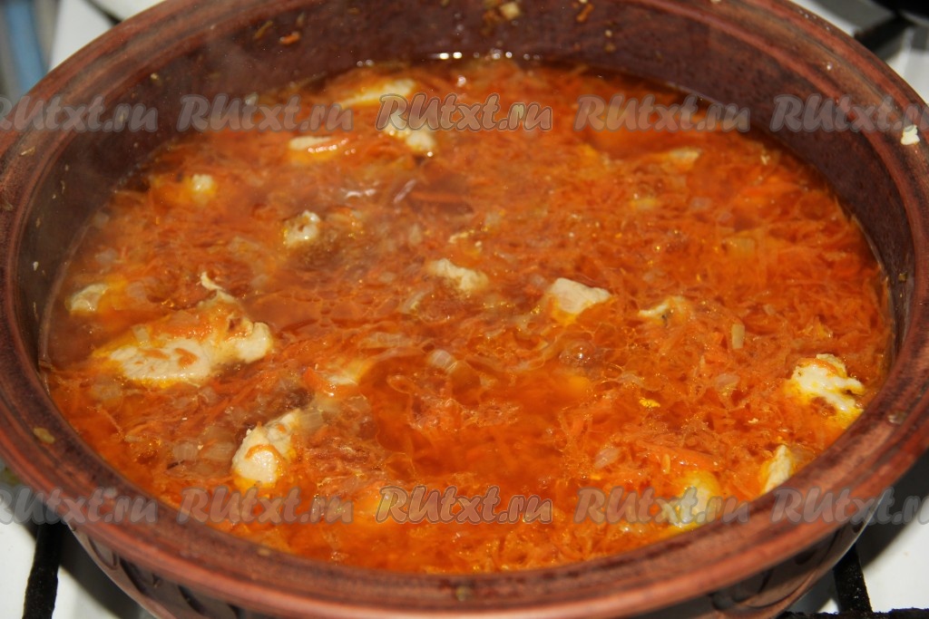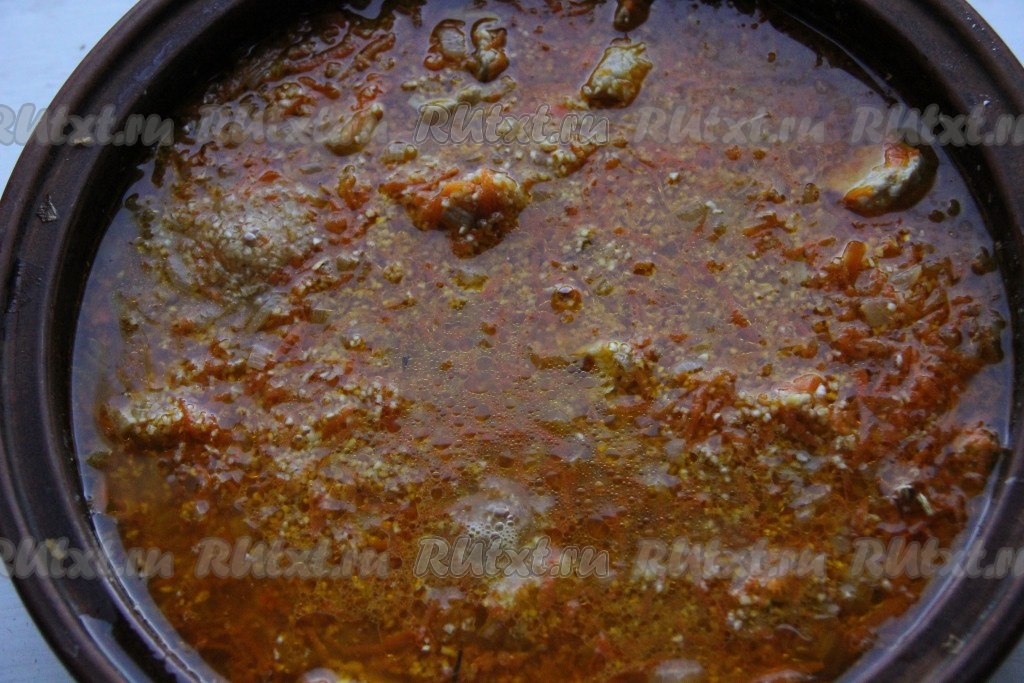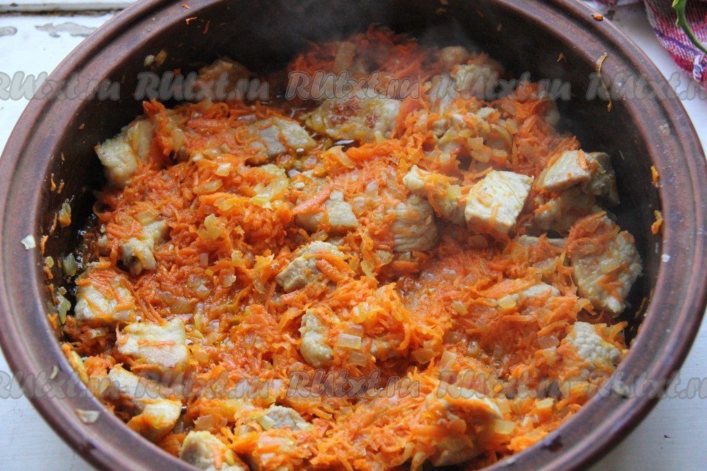 Тушим все на медленном огне, периодически помешивая, до мягкости моркови. Заливаем мясо водой и варим до мягкости мяса.