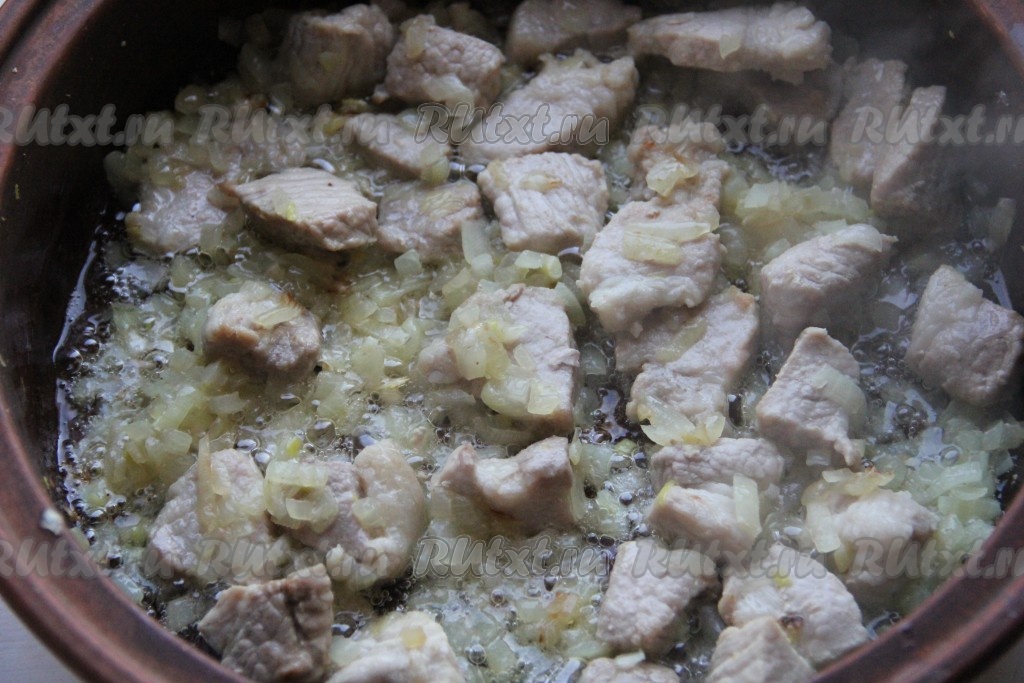 Мясо нарезаем произвольными кусочками и обжариваем со всех сторон до золотистого цвета на сковороде на разогретом растительном масле.