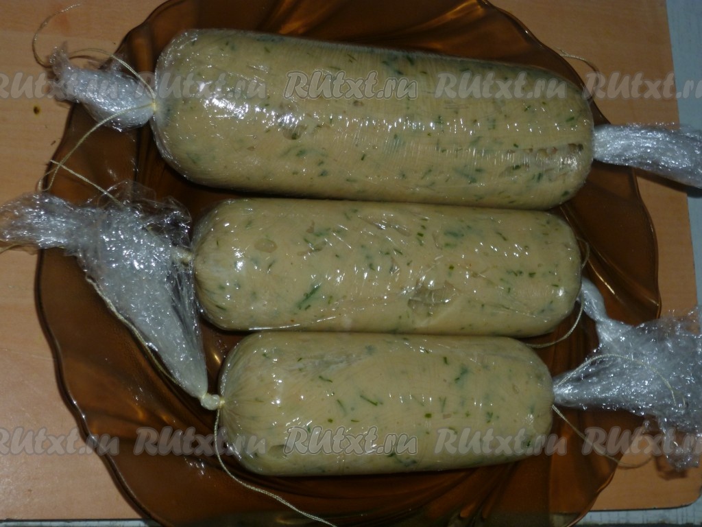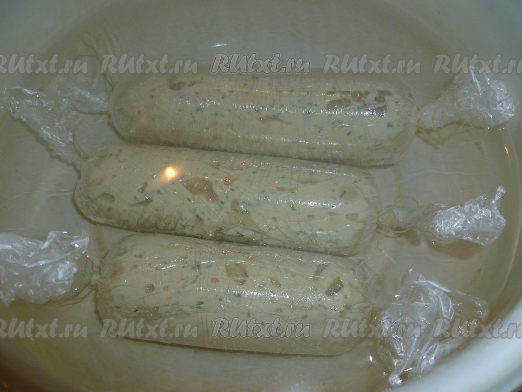 Затем домашние куриные сосиски аккуратно достать из воды, разрезать пленку и вынуть сосиски. Деткам можно подать в таком виде. А для взрослых, чтобы было ещё вкуснее, можно запечь в духовке или обжарить сосиски на сковороде.