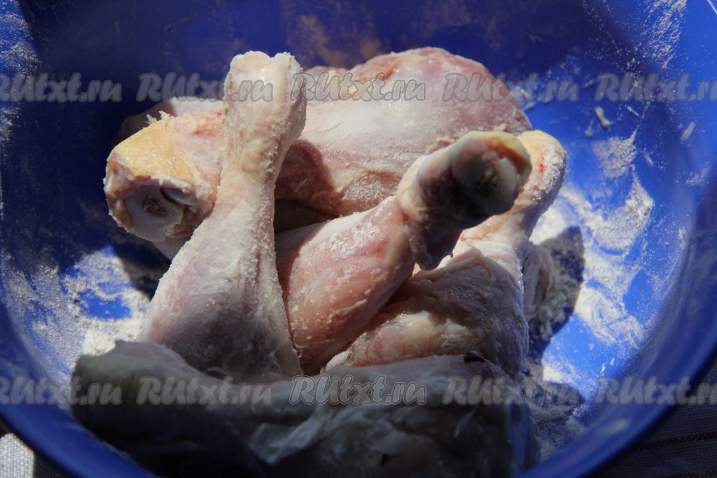 Куриные ножки вымыть, обсушить, по желанию, снять с них кожу. Посолить куриные ножки и обвалять в муке со всех сторон.