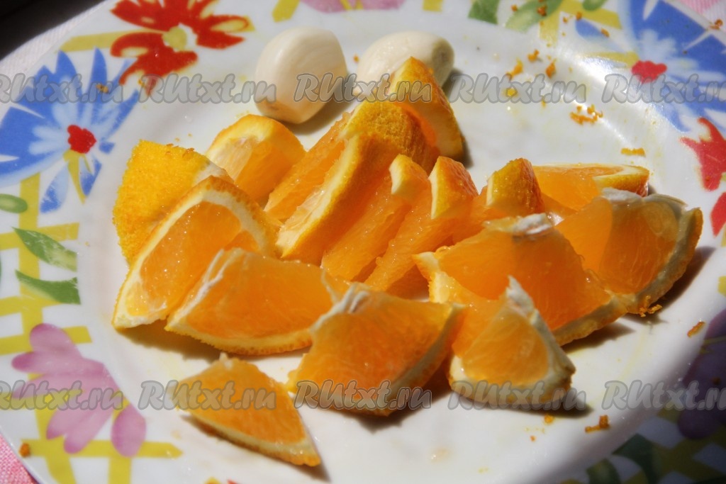 Апельсины тщательно вымыть. Из 1,5-2 апельсинов выдавить 100 миллилитров сока. Залить ножки свежевыжатым соком и оставить минут на 15, за это время их нужно будет 2-3 раза перемешать, чтобы они равномерно пропитались соком. Отдельно в тарелку нарезать оставшийся вымытый, неочищенный от кожуры апельсин. Чеснок очистить и нарезать на пластины.