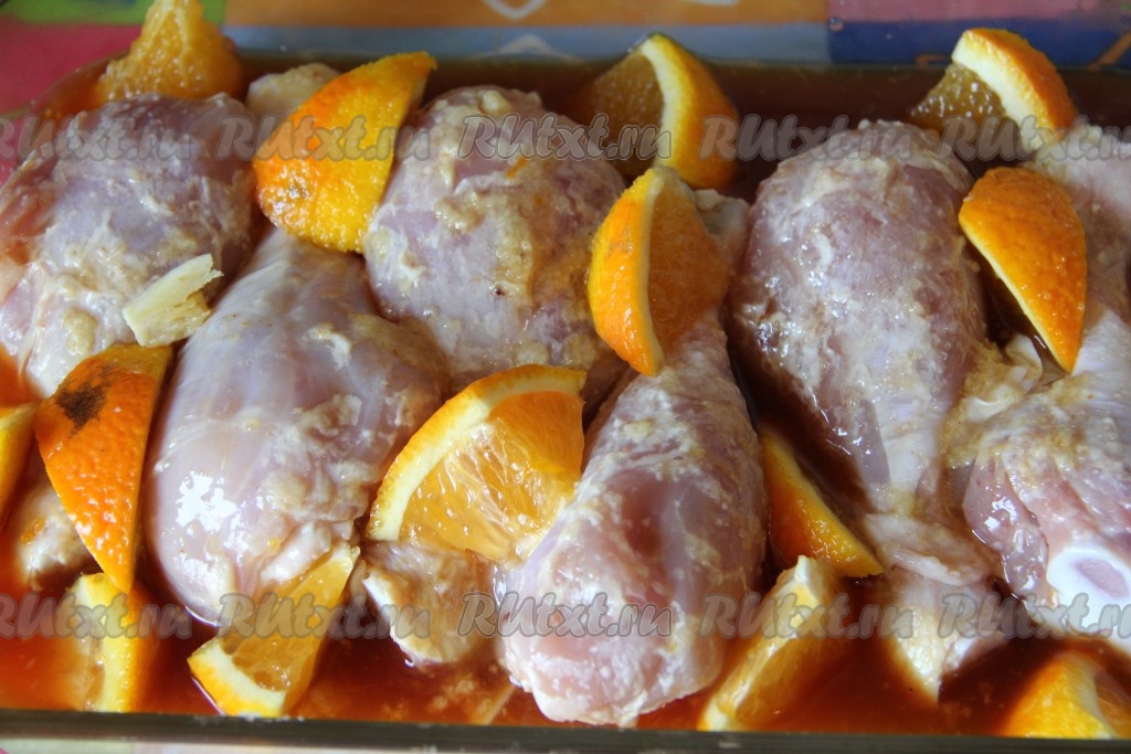 В форму для запекания выкладываем куриные ножки вместе с апельсиновым соком, в котором они мариновались, затем раскладываем чеснок и апельсин. Накрываем форму для запекания крышкой (или фольгой) и отправляем в разогретую духовку, запекаем 35 минут при температуре 180 градусов. Затем снимаем крышку (или фольгу) и готовим ещё 15 минут.