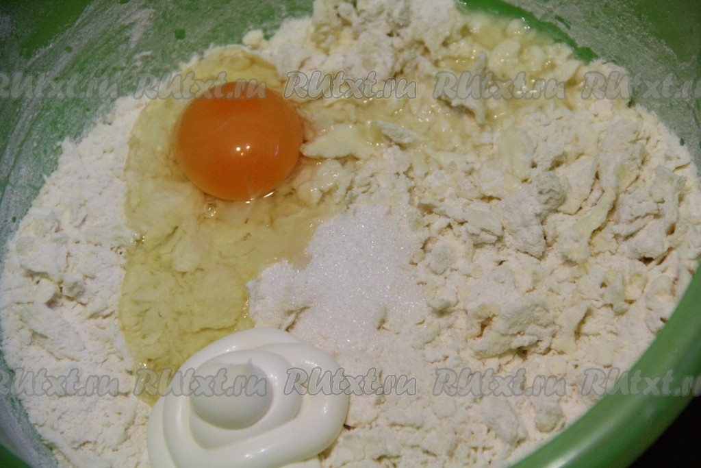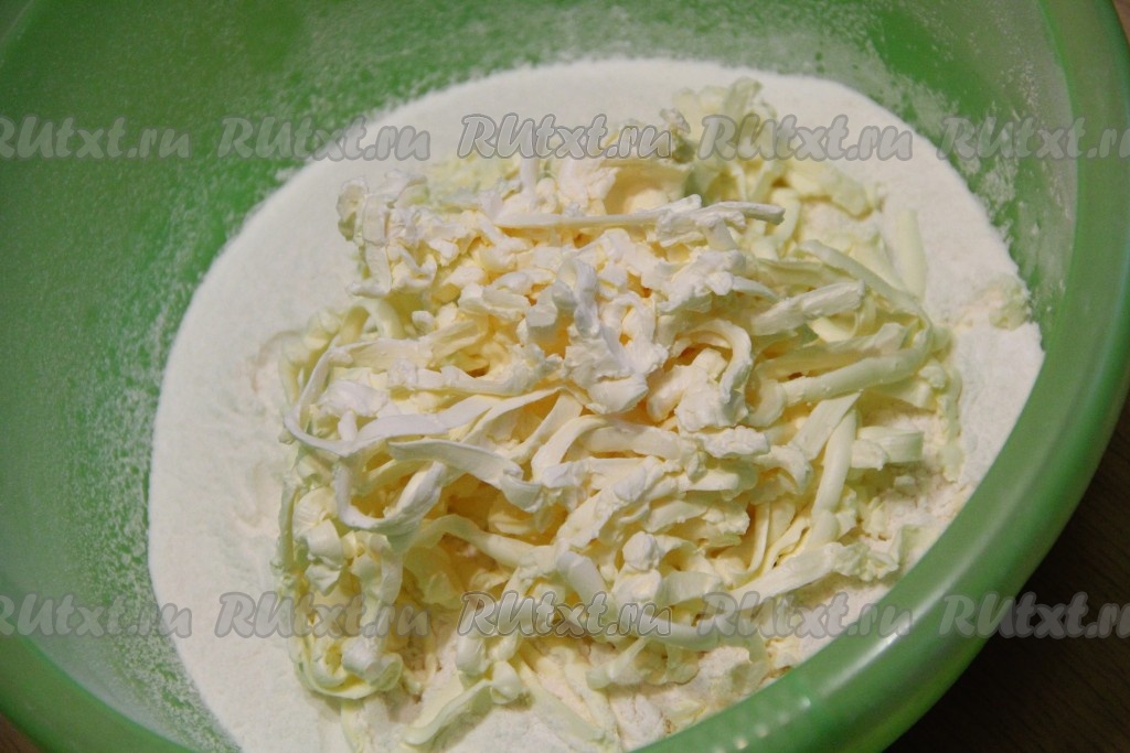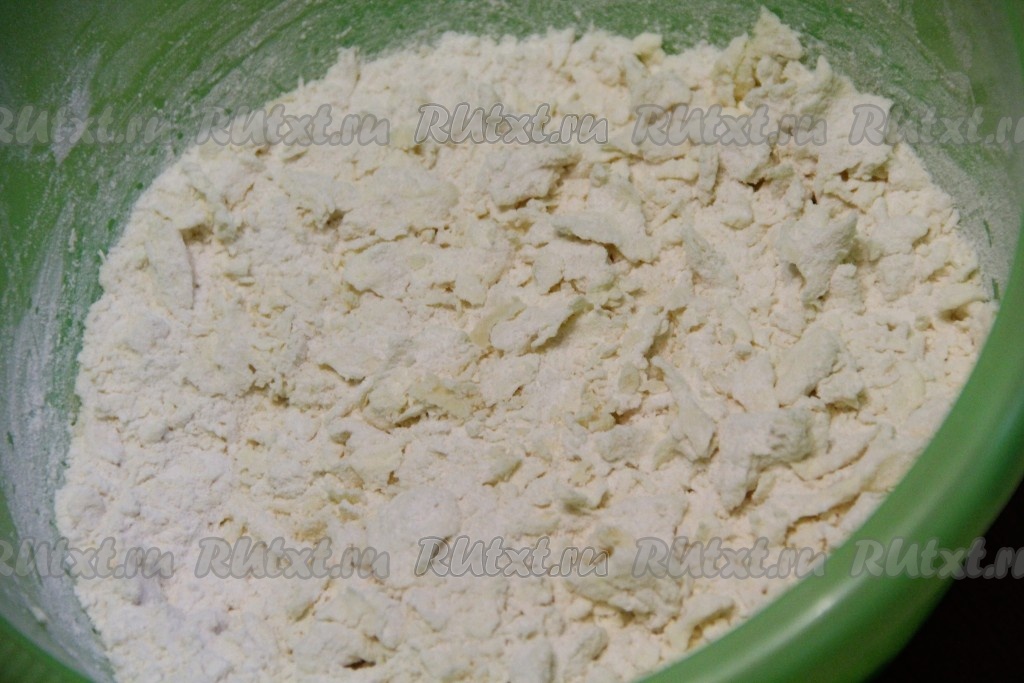 Маргарин для выпечки натереть на крупной тёрке и добавить к муке. Можно маргарин порубить ножом на мелкие кусочки.