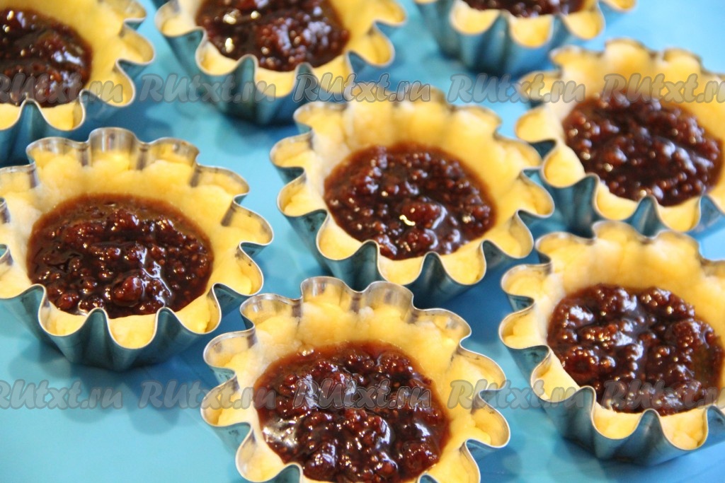 Выложить начинку (у меня варенье) в корзиночки из песочного теста, заполняя на 1/3 объёма.