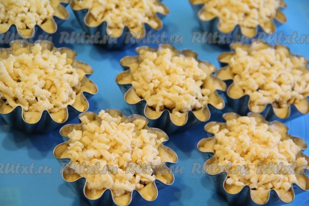 Достать оставшееся тесто из морозильной камеры и натереть его на крупной тёрке. Выложить кусочки теста поверх варенья, как бы создавая "шапочку". Переставить корзинки на противень для выпекания и поставить в разогретую духовку. Выпекать корзиночки с вареньем при 180-200 градусах примерно 20-25 минут до золотистого цвета.