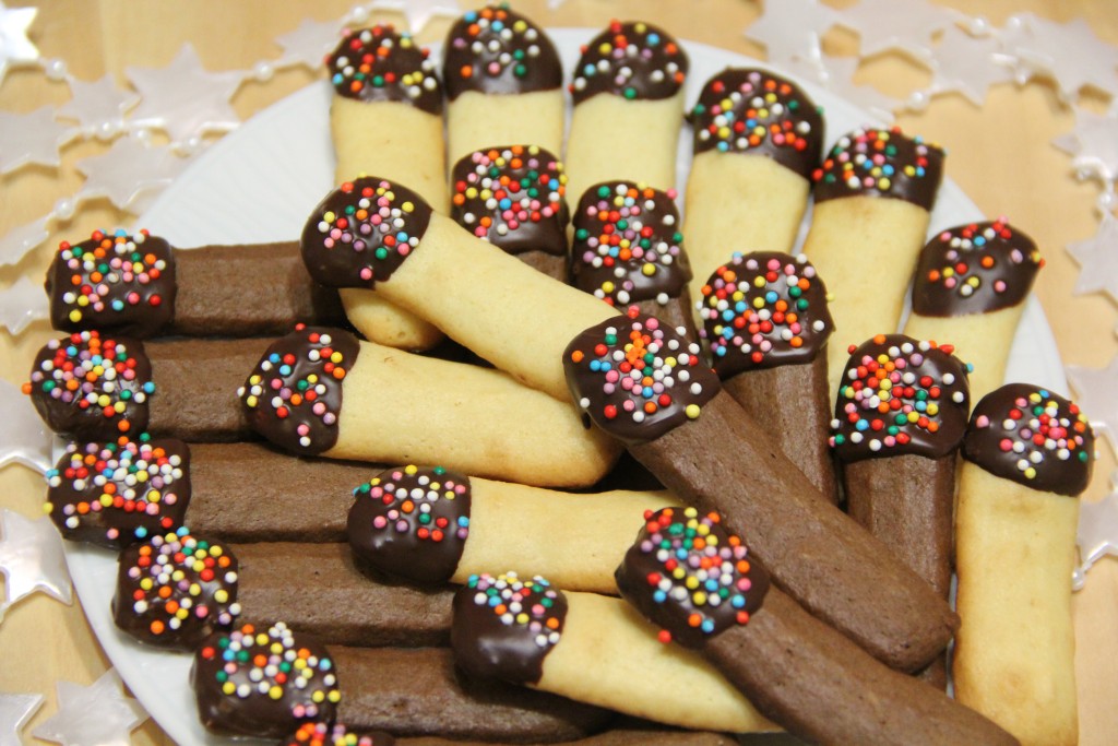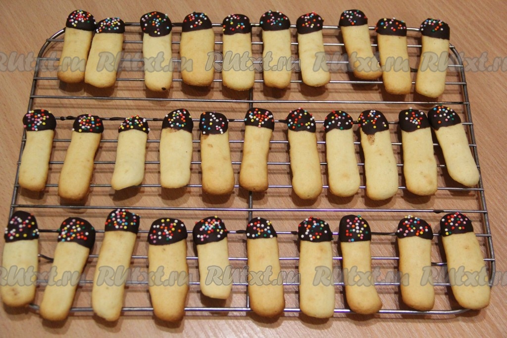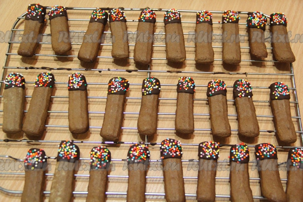 Поставить противень с печеньем, замешанным на яичных белках, в разогретую духовку и выпекать минут 15 (до лёгкого золотистого цвета) при температуре 180 градусов. Готовое печенье остудить и можно кушать. Я решила украсить печенье, для этого нужно растопить шоколад, окунуть печенье в шоколад, а затем посыпать цветной посыпкой и оставить на решётке до застывания шоколада.