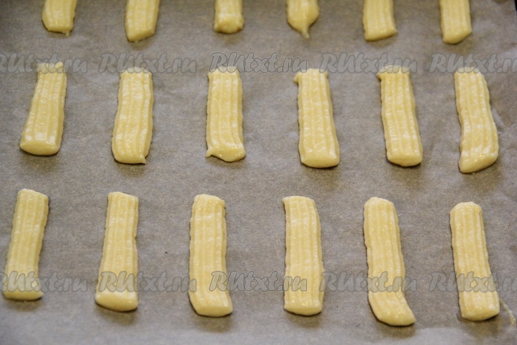 Противень для выпечки застелить пергаментной бумагой. Переложить тесто в целлофановый пакет, отрезав уголок, или в кондитерский мешок и отсадить белое тесто в виде полосок длиной примерно 5 сантиметров.