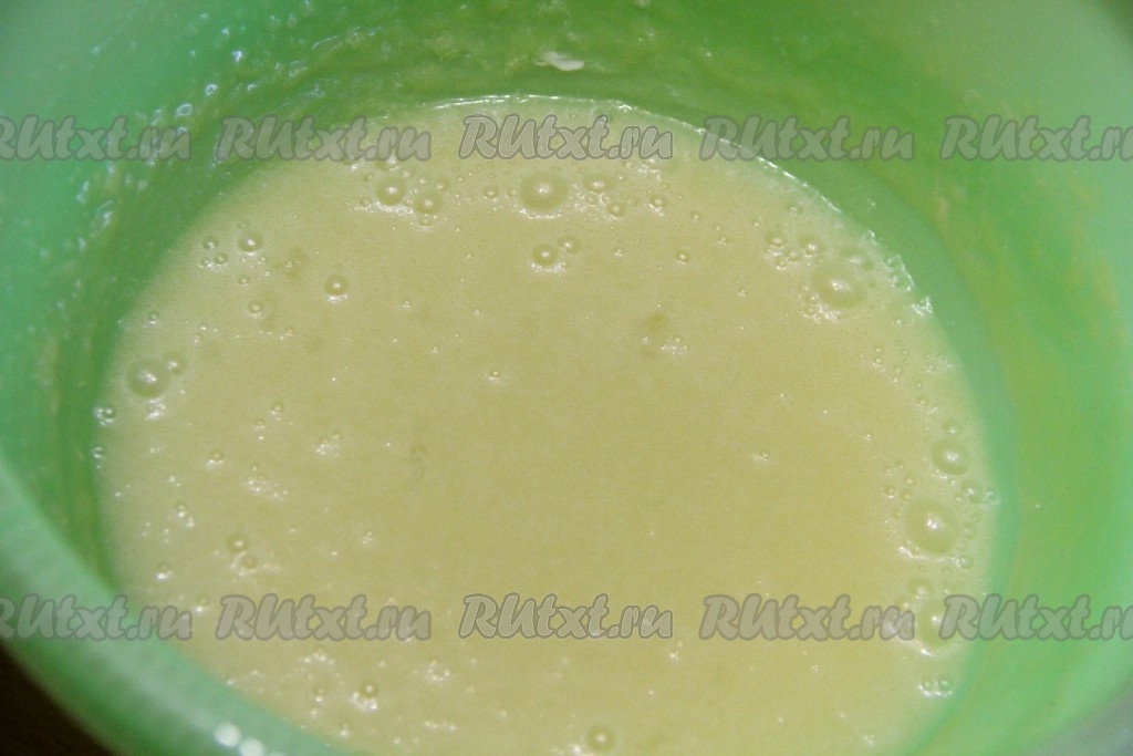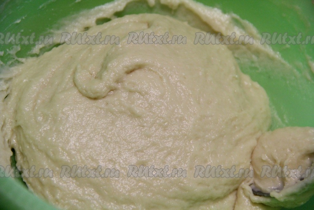 Далее всыпать разрыхлитель, начать частями добавлять муку, полностью вмешивая её в тесто.