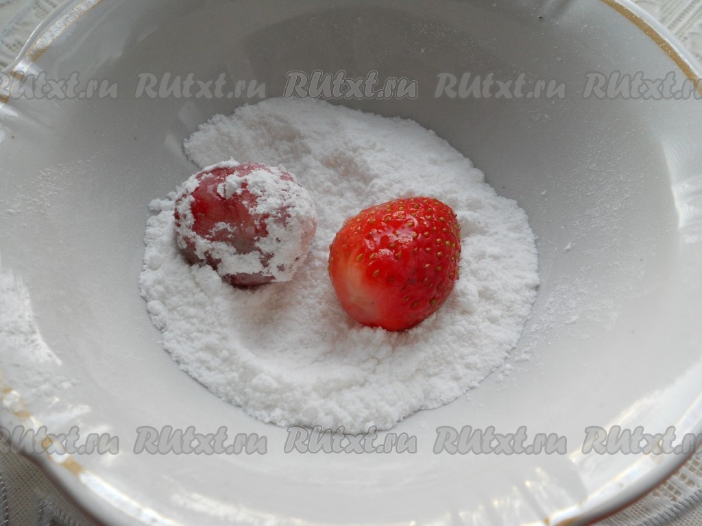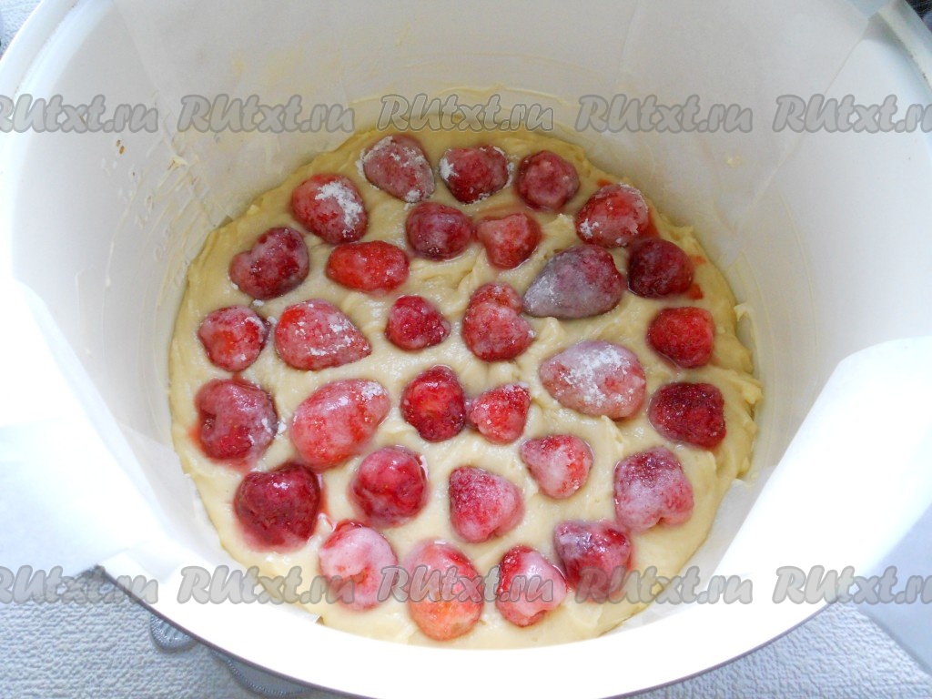 Выложить готовое тесто в чашу мультиварки. Клубнику помыть, обсушить. Целенькие ягоды обвалять в сахарной пудре.