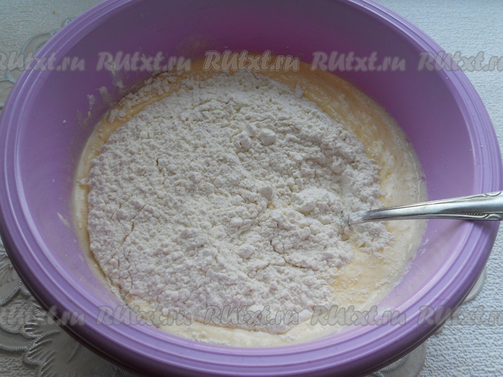 Массу перемешать и всыпать просеянную с разрыхлителем муку и ванилин.