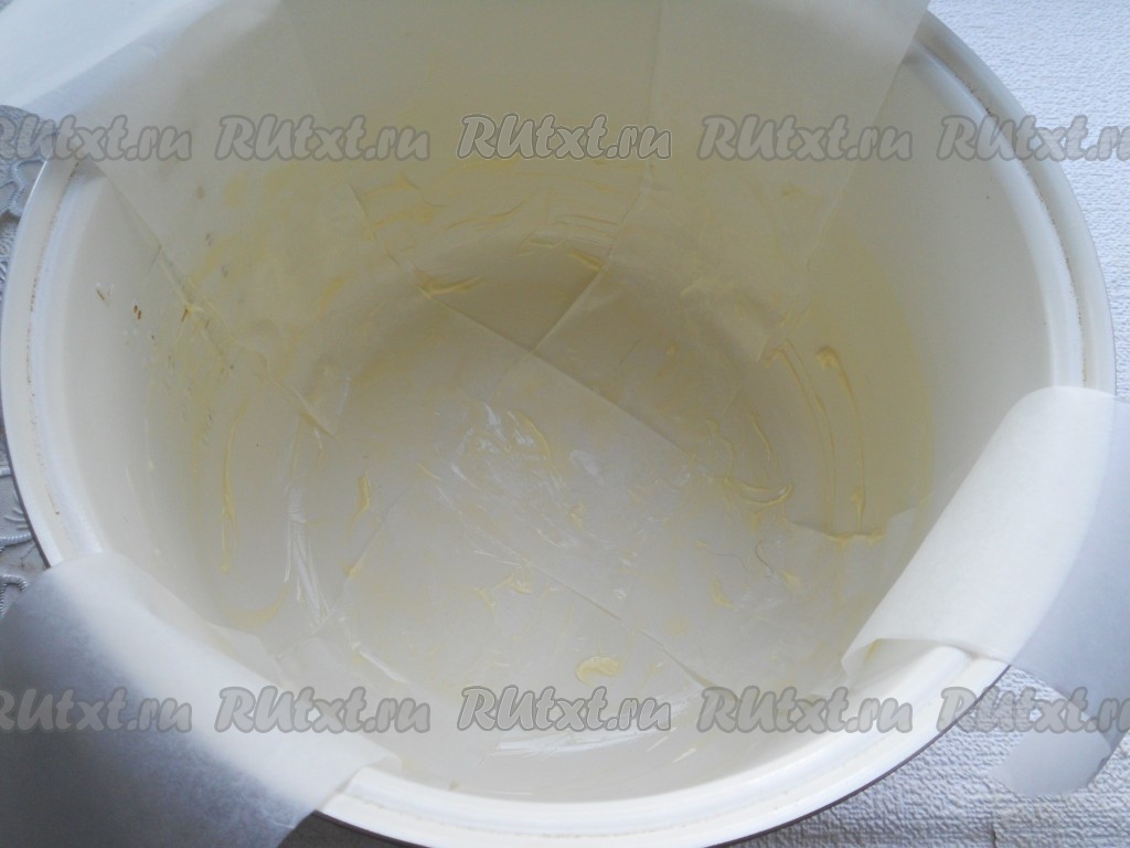 Чашу мультиварки хорошо смазать сливочным маслом. Из пергамента вырезать длинные полосы, шириной около 8-10 см. Разместить их в чашу крест-накрест (это нужно для того, чтобы легко вынуть готовый пирог, не повредив его).
