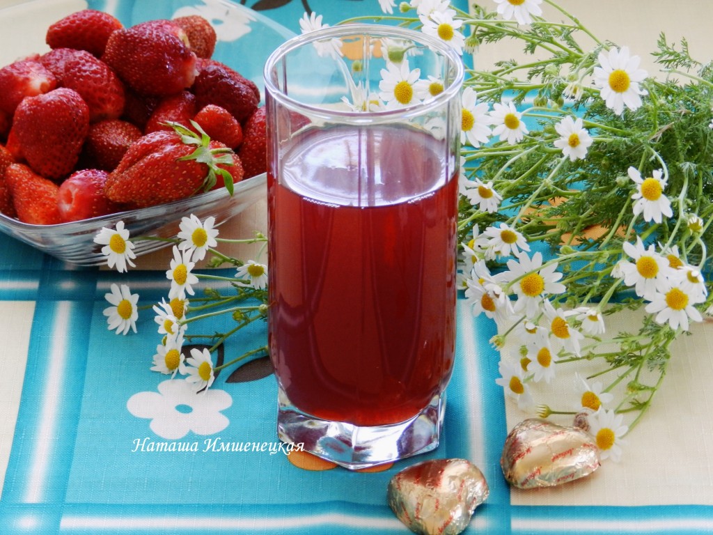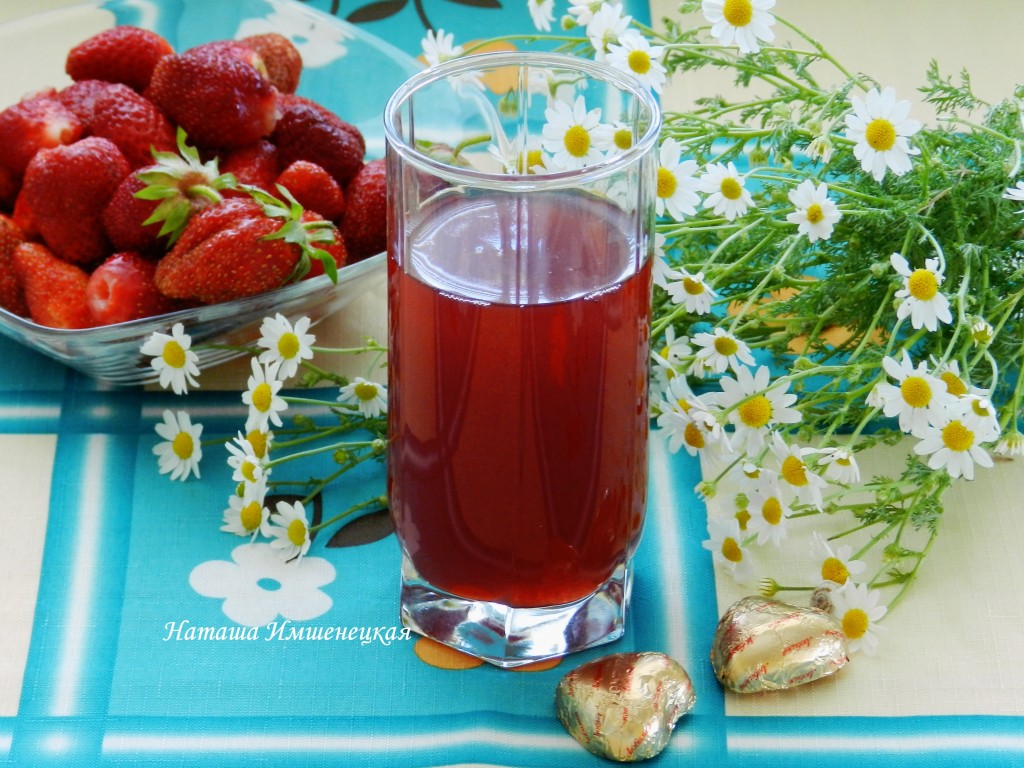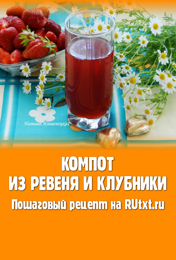 Вкусный и ароматный компот из ревеня и свежей клубники готов.