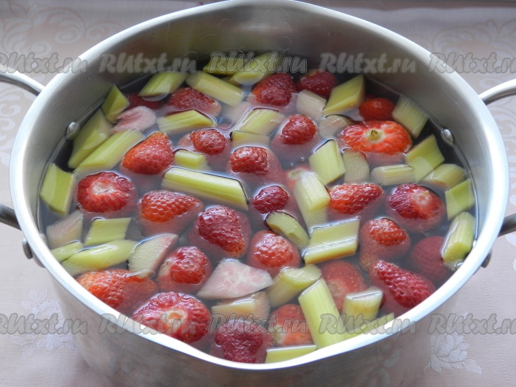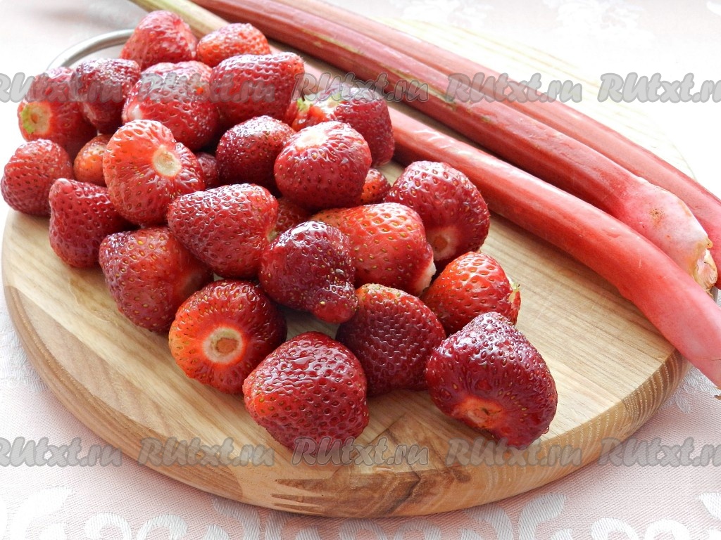 Клубнику и ревень вымыть. У ягод удалить чашелистики, с ревеня снять верхнюю кожицу.