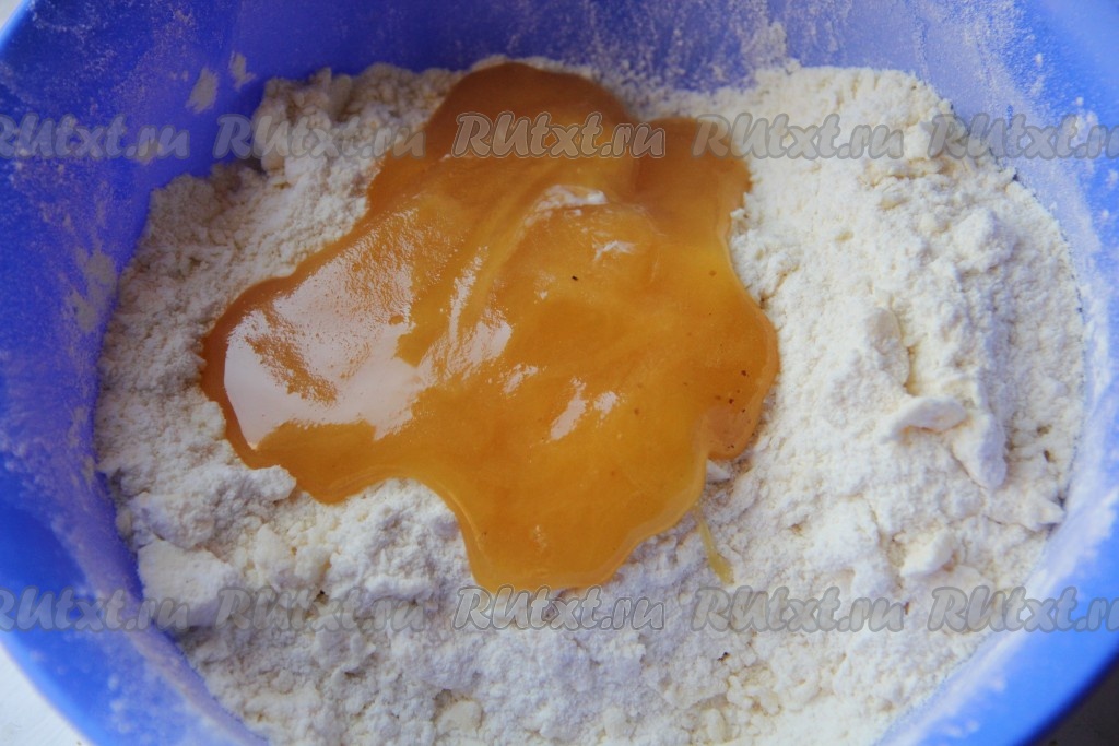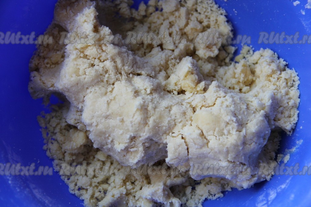 Муку смешиваем с 50 граммами сахара и разрыхлителем, добавляем кусочки холодного сливочного масла. Быстро растираем массу руками, чтобы наше масло не начало таять.