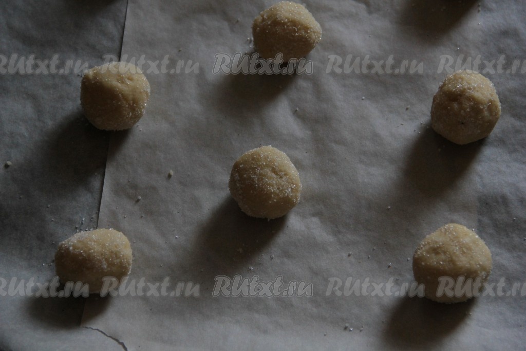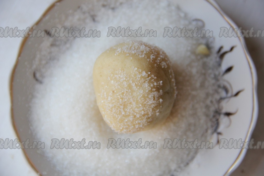 Отщипываем от теста небольшие кусочки и скатываем их в шарики размером с грецкий орех. 50 грамм сахара насыпаем в тарелку. Полученные шарики обваливаем со всех сторон в сахаре.
