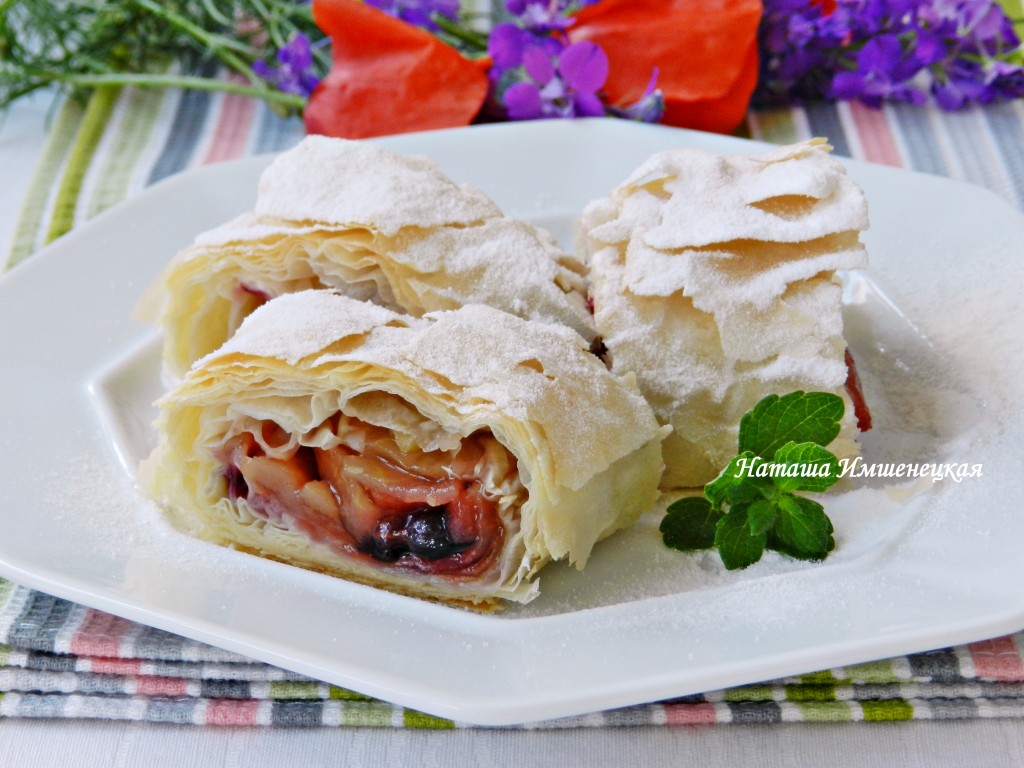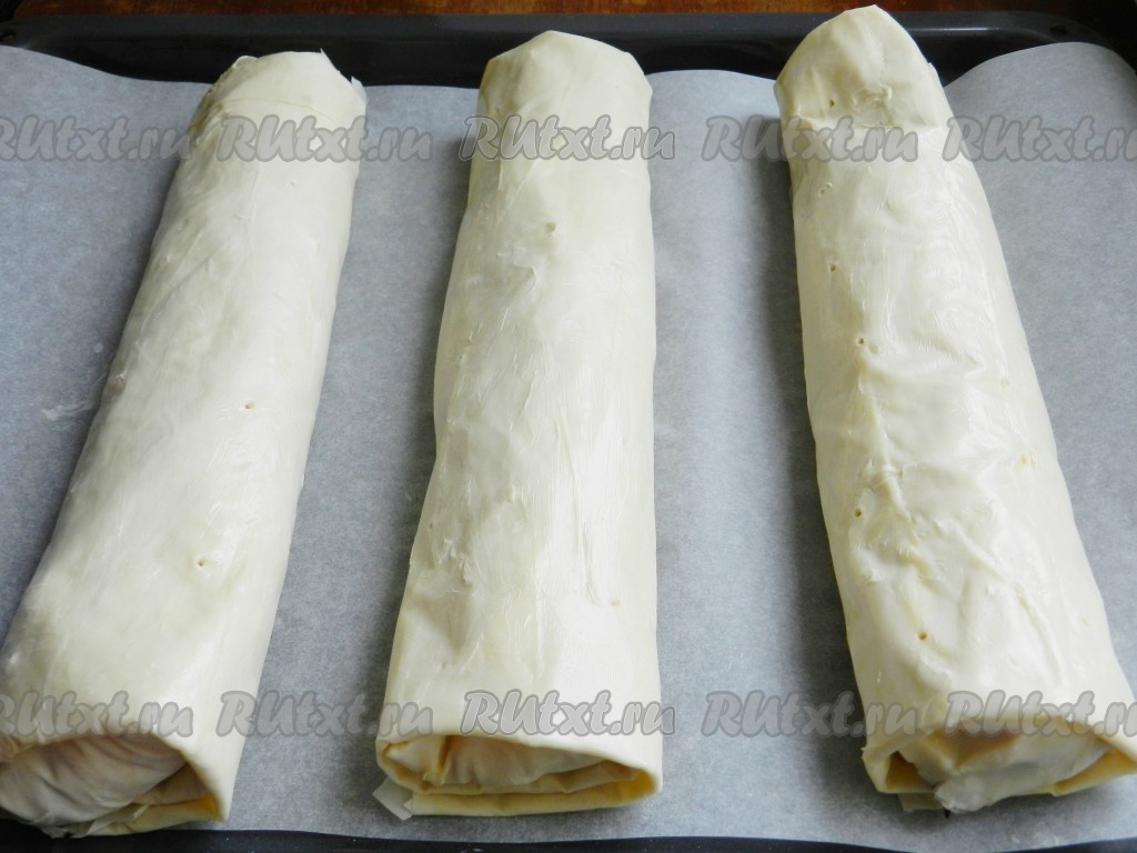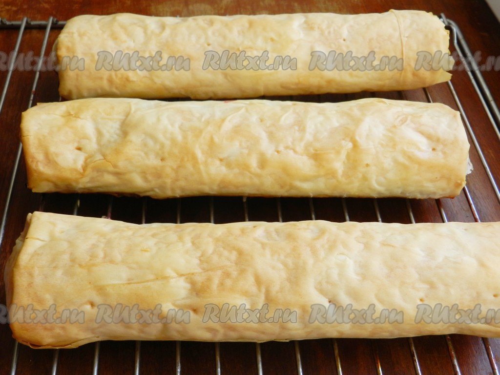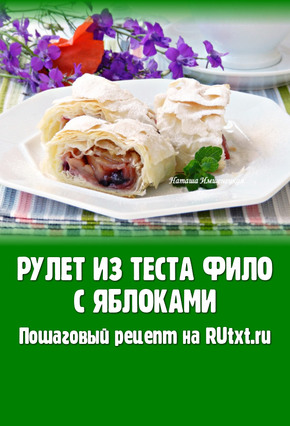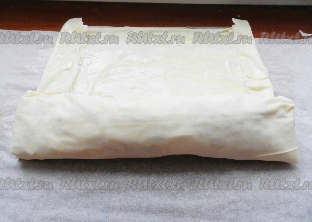 Подвернуть боковые края теста фило немного на начинку, а затем свернуть в рулет, начиная со стороны с яблочной начинкой.