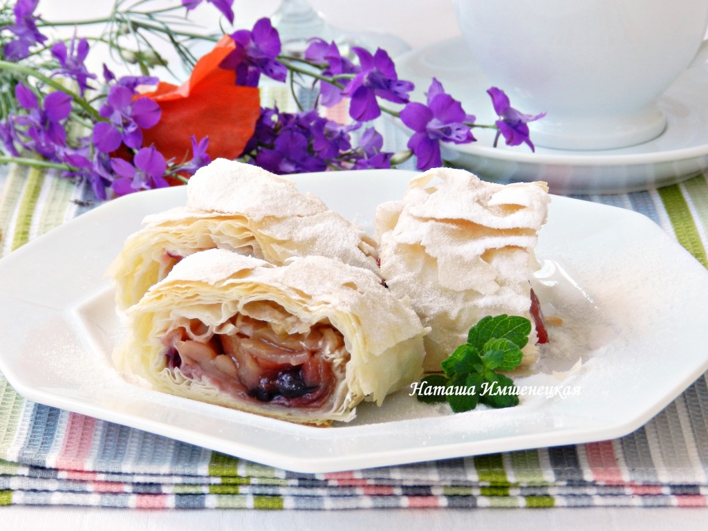 А вот как выглядит в разрезе рулет из теста фило. Слоистое тесто и сочная начинка из яблок делают эту выпечку очень вкусной и нежной.