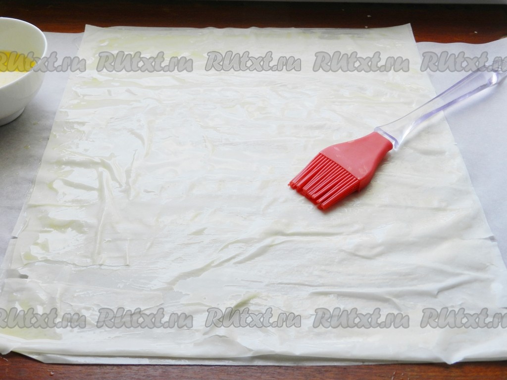 Тесто фило заранее разморозить. Сливочное масло растопить. Расстелить лист теста, хорошо смазать маслом с помощью кисти, накрыть вторым листом и снова смазать. Таким образом, не забывая промазывать маслом, выложить четыре листа теста друг на друга.
