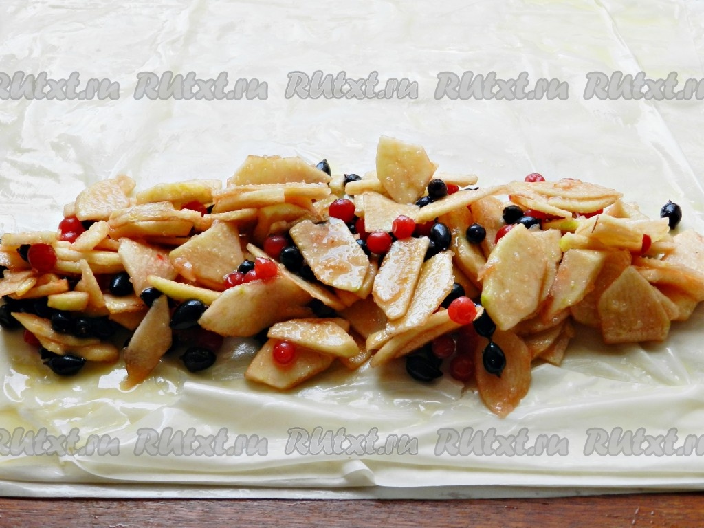 Всыпать к яблокам крахмал и сахар. Я ещё добавила немного свежих ягод, но это по желанию. Перемешать яблоки с крахмалом, ягодами и сахаром до однородности. Всего я сформировала 3 рулета, то есть для формирования каждого рулета я взяла 4 листа тесто фило. Поэтому и начинку разделила на 3 равных части. Выложить на тесто 1/3 яблочной начинки ближе к одному из краёв теста, оставляя при этом края теста чистыми.