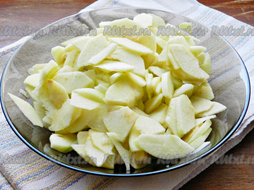 Яблоки очистить от кожуры и семечек, нарезать на тонкие пластинки.