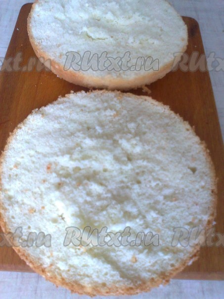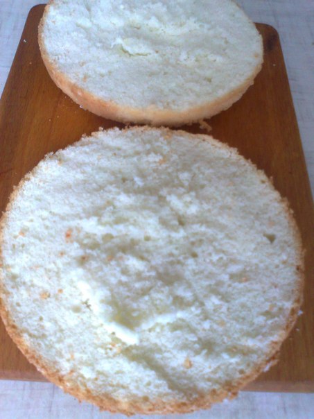 Я приготовила бисквит из 2 яиц для пробы. Использовать бисквит по назначению. Я решила приготовить торт. Разрезала бисквит пополам и получилось два коржа.