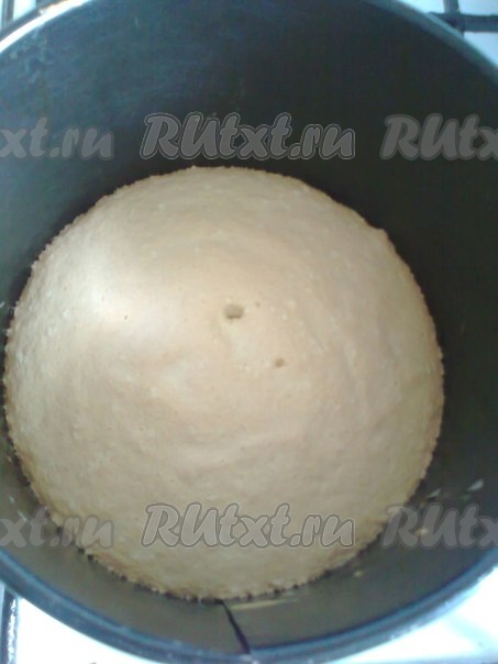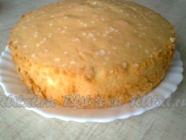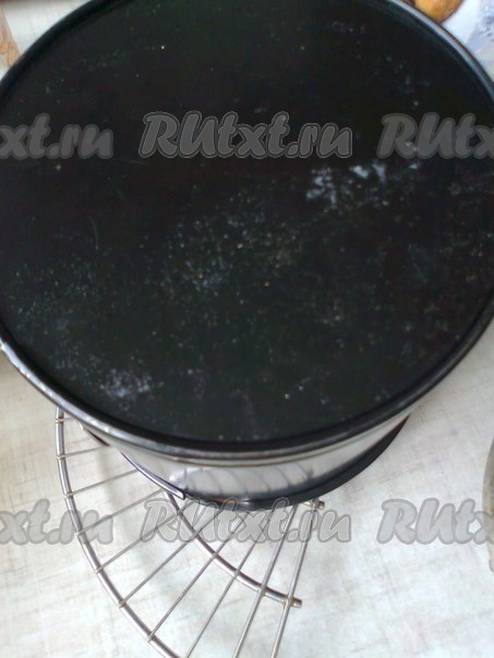 Вынимаем готовый бисквит из духовки, переворачиваем вверх дном и поднимем на высоту приблизительно 50 см над столешницей. Бросаем форму с бисквитом вниз на столешницу (не бойтесь, ничего не случится, бисквит не выпадет. Все хозяйки, которые пекли этот бисквит, тоже его бросали). Потом вверх дном, как есть, ставим на решетку до полного остывания (3-5 часов, можно дольше).