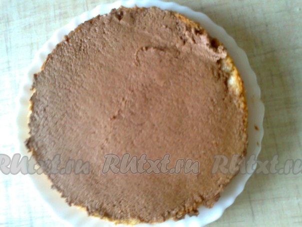 Для приготовления сиропа 50 мл молока, 50 грамм сахара и 1 чайную ложку какао смешала, поставила на огонь и проварила до растворения сахара. Пропитала коржи сиропом. Затем один пропитанный бисквитный корж промазала шоколадным сливочным кремом (Для приготовления крема молоко вскипятить и остудить до комнатной температуры. Масло нагреть до комнатной температуры. Все ингредиенты для приготовления крема соединить, перемешать ложкой и взбивать миксером на самой низкой скорости до тех пор, пока масса не станет однородной, перламутрового цвета, примерно 3-5 минут. Крем получается пышным, нежным, с лёгким ванильным ароматом).