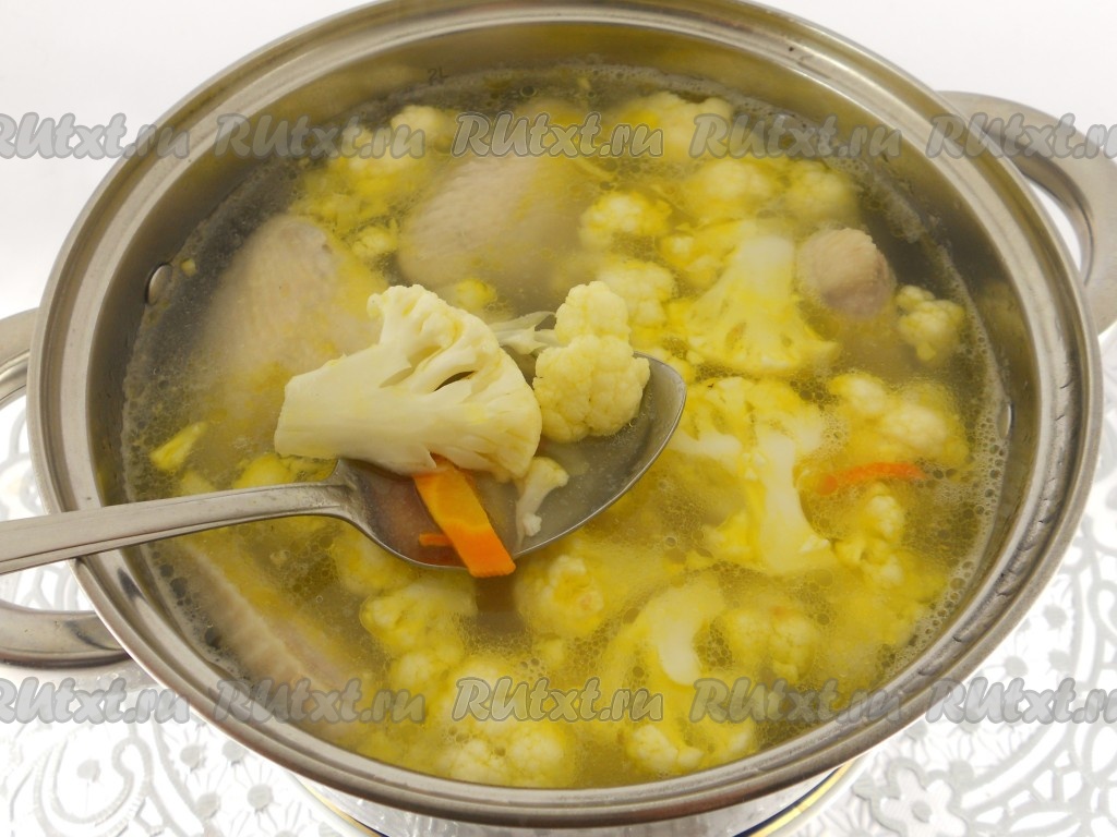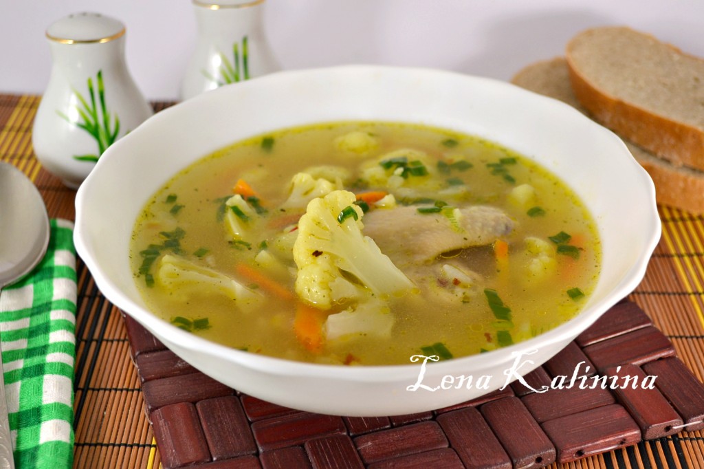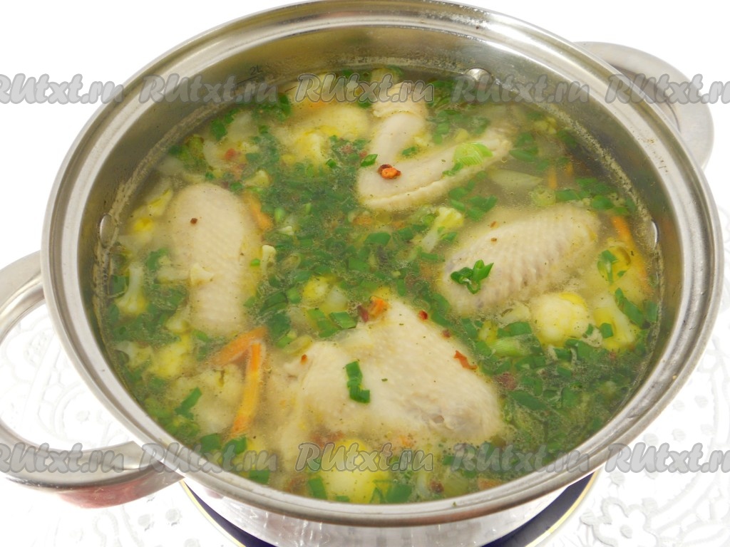 Дать ароматному и вкусному куриному супу с цветной капустой настояться минут 15, разлить по тарелкам и подать к столу. Лучше такой суп варить на один раз.