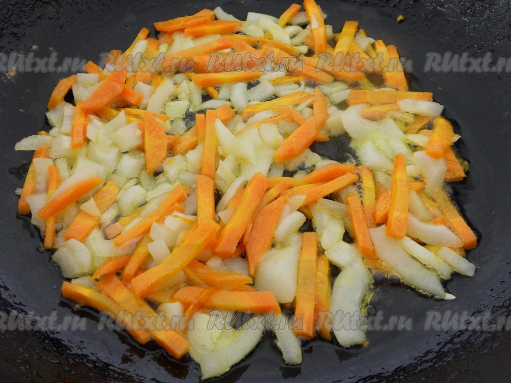 Варить также на слабом огне 15-20 минут. В это время порезать лук и морковь, обжарить на растительном масле до мягкости лука.