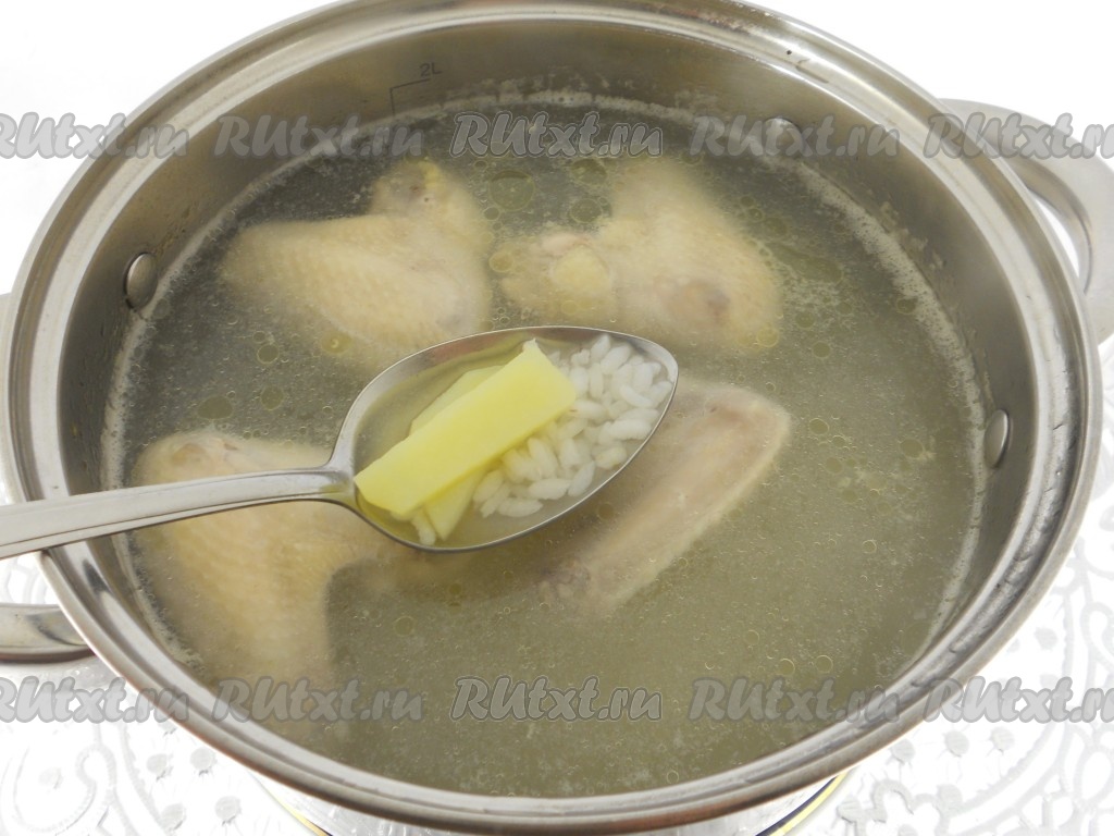 Куриные крылышки поместить в кастрюлю, залить водой и поставить на огонь. Довести до кипения, снять пену, посолить по вкусу. Варить крылышки на медленном огне 10 минут, после чего добавить в кастрюлю картофель и промытый рис.