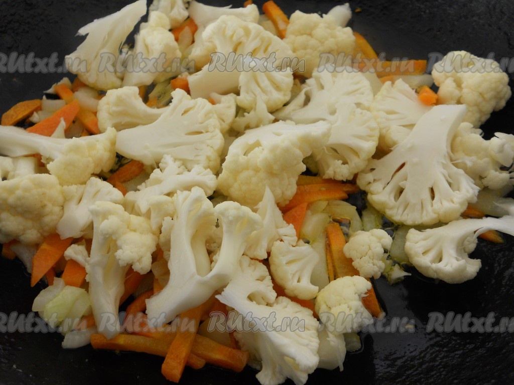 В сковороду к луку и моркови добавить соцветия сырой цветной капусты. Перемешать и обжарить все вместе в течение 5 минут.