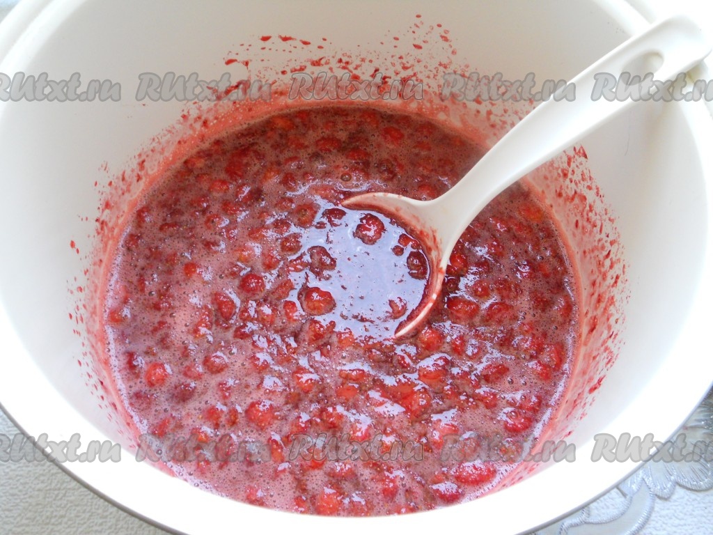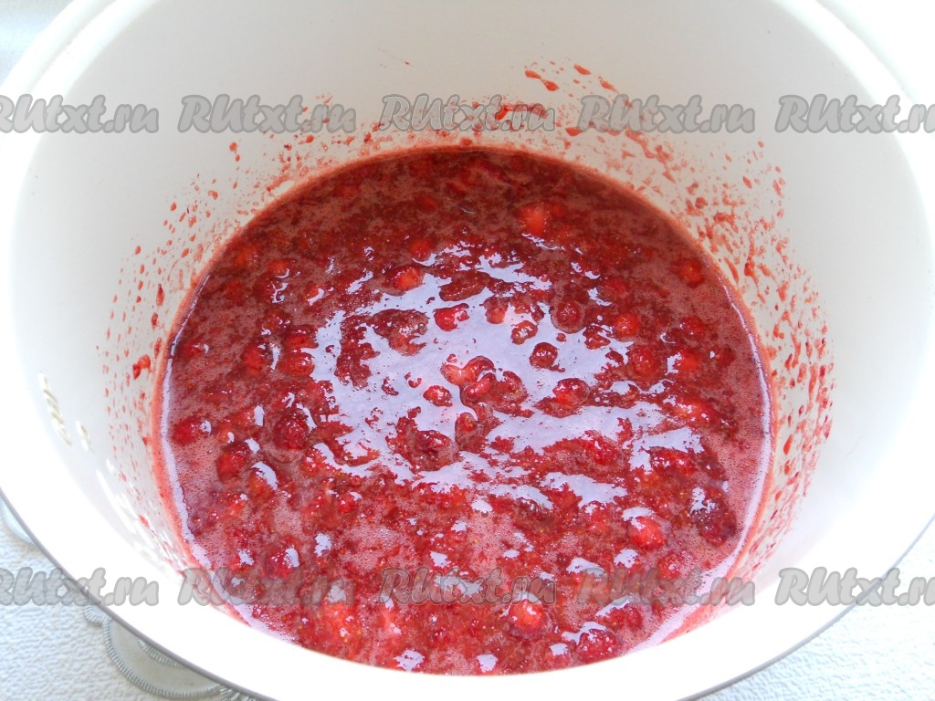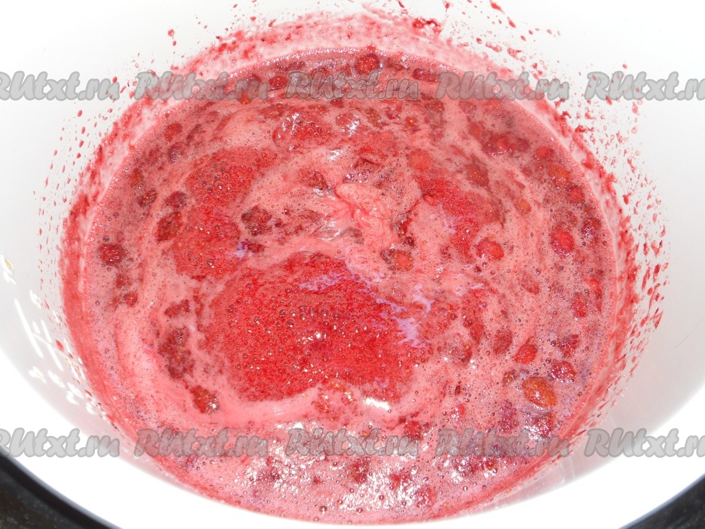 За 5 минут до окончания готовки влить лимонный сок, перемешать клубничный джем. Он получается насыщенным, красивым, по консистенции редковатым. Так и должно быть, при охлаждении джем загустеет.