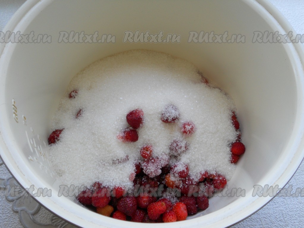 Клубнику хорошо вымыть, удалить хвостики. Поместить клубнику в чашу мультиварки, засыпать сахаром.