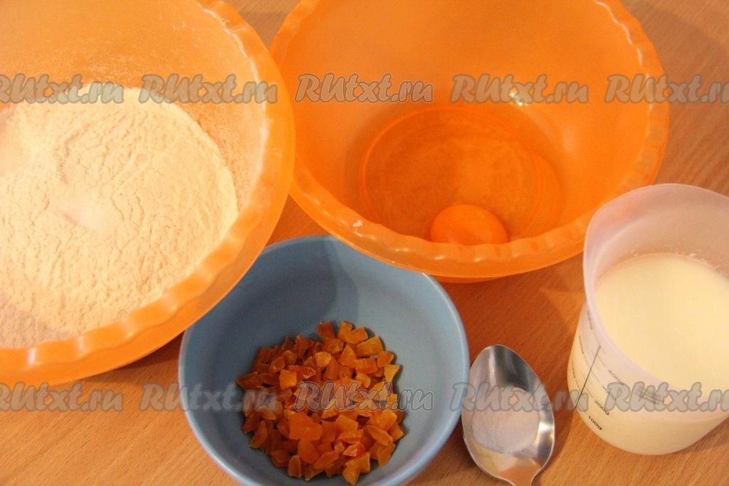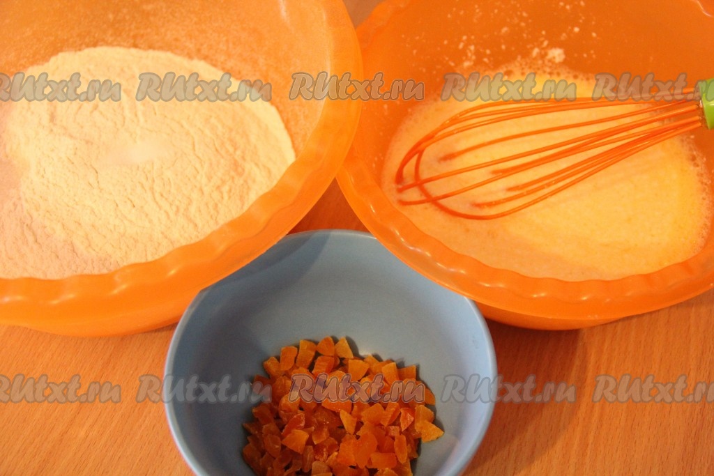 Муку просеять. Обдать курагу кипятком, откинуть на дуршлаг, затем обсушить и нарезать достаточно мелко (измельчить курагу можно с помощью ножниц).
