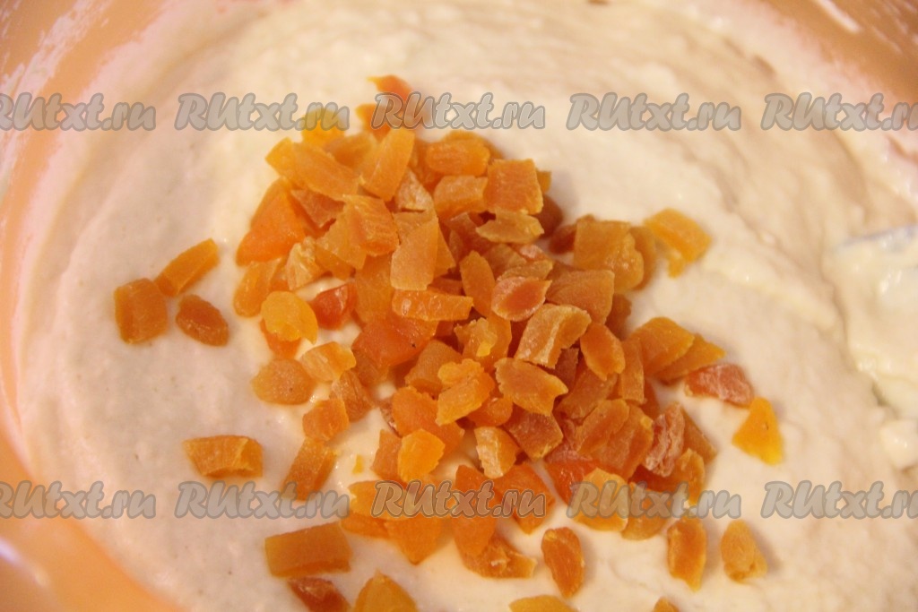 В получившуюся смесь всыпать 200 грамм муки, хорошо перемешать венчиком. Затем, постепенно добавляя оставшуся муку, замесить в меру густое тесто (как на фото). Муки может понадобиться чуть больше или чуть меньше, ориентируйтесь по консистенции теста. Долго перемешивать тесто не стоит, пусть оно останется слегка комковатым. Затем добавить курагу (или другие сухофрукты) и тщательно перемешать.