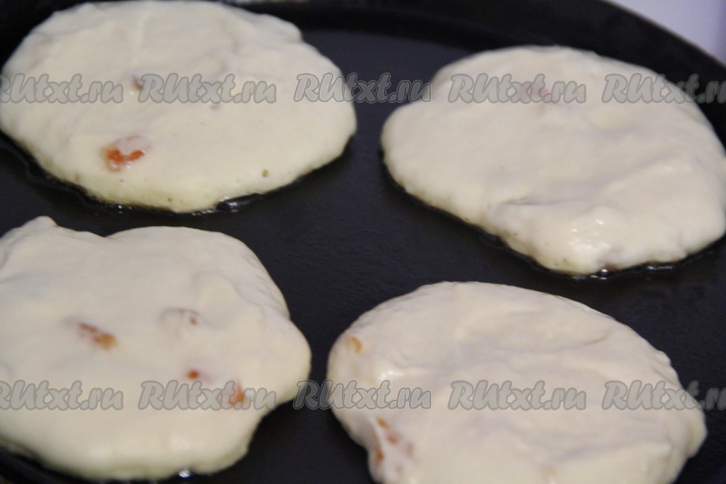 Жарить оладушки с курагой с двух сторон до золотистого цвета.