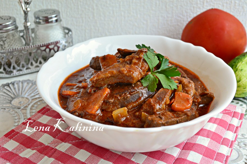 Перемешать и обжаривать все вместе, периодически помешивая, уже на небольшом огне минут 10, после чего добавить в сковороду томатную пасту, влить бульон или воду. Перемешать. Переложить свиную печень с овощами в кастрюльку и тушить на маленьком огне минут 15, периодически перемешивая. Если нужно, добавить еще водички и соли.