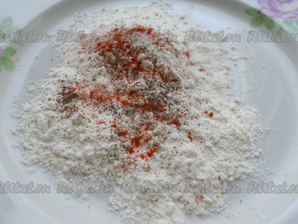 Далее печень промыть водой в дуршлаге, дать стечь воде. Всыпать в плоскую тарелку муку, добавить немного соли, черного молотого перца и паприку. Перемешать.