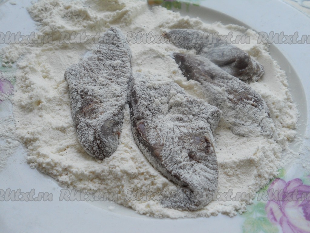 Обвалять тщательно каждый кусочек печени в мучной смеси.