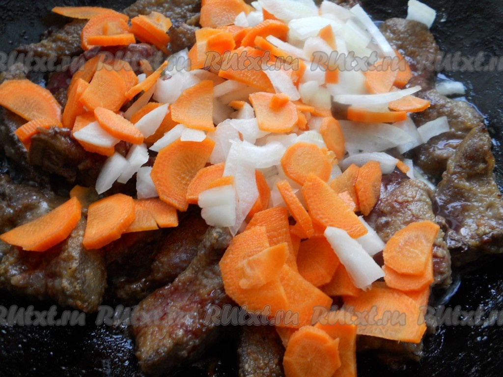 Добавить к печени порезанный средними кусочками репчатый лук и морковь, порезанную тонкими полукружочками.