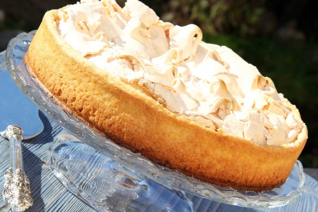 Духовой шкаф выключить и оставить песочный пирог с творогом и безе в духовке до её полного остывания. Затем полностью остудить при комнатной температуре. Аккуратно снять бортики формы и переложить пирог на тарелку или подставку под пирог.