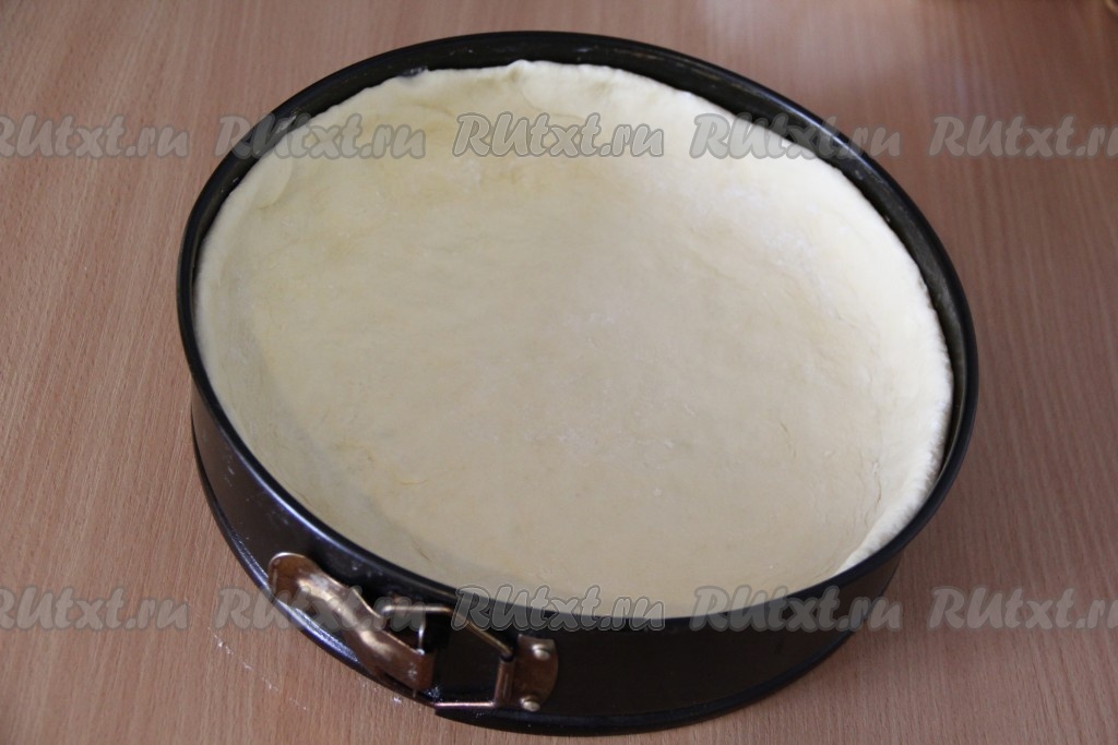 Тесто выложить в форму, слегка смазанную растительным маслом. Аккуратно разровнять тесто по форме, сформировать высокие бортики. Я использовала форму диаметром 26 см с разъёмными бортами.