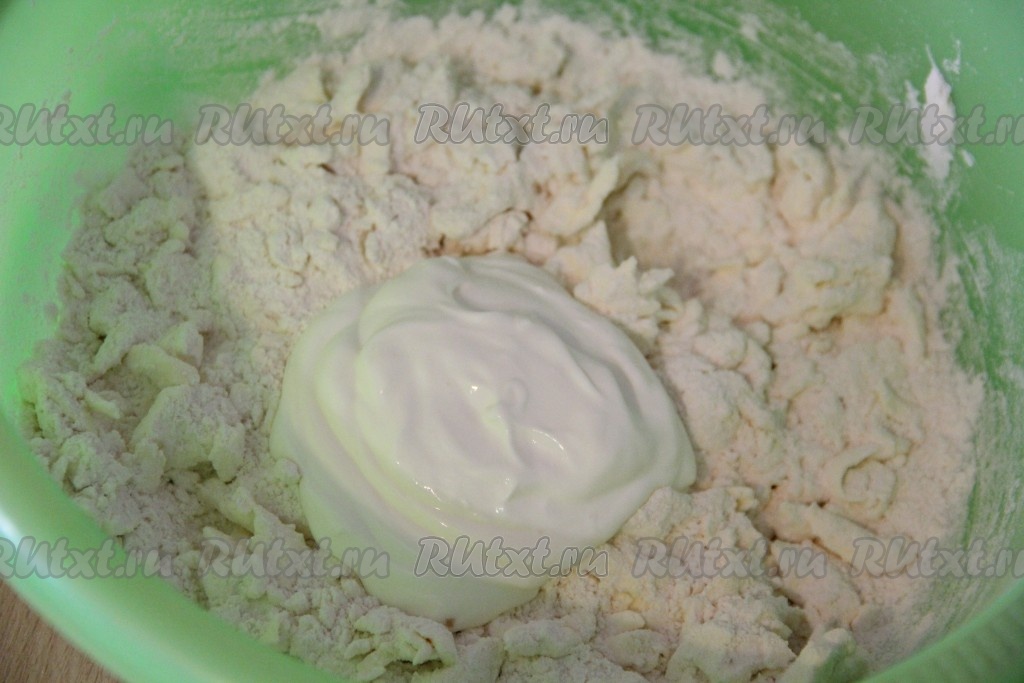 Маргарин перетереть с мукой в мелкую крошку. Затем добавить сметану и замесить тесто.
